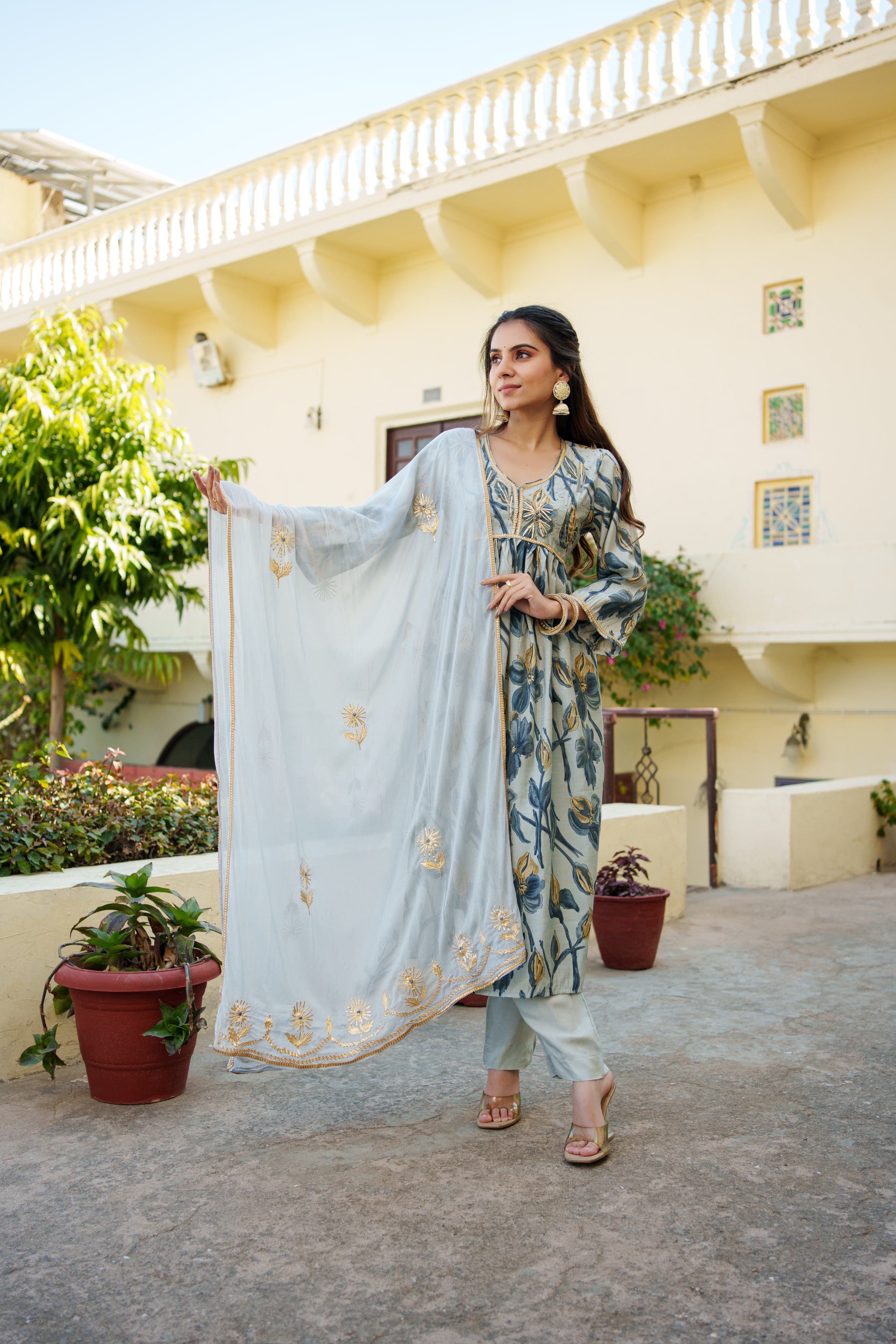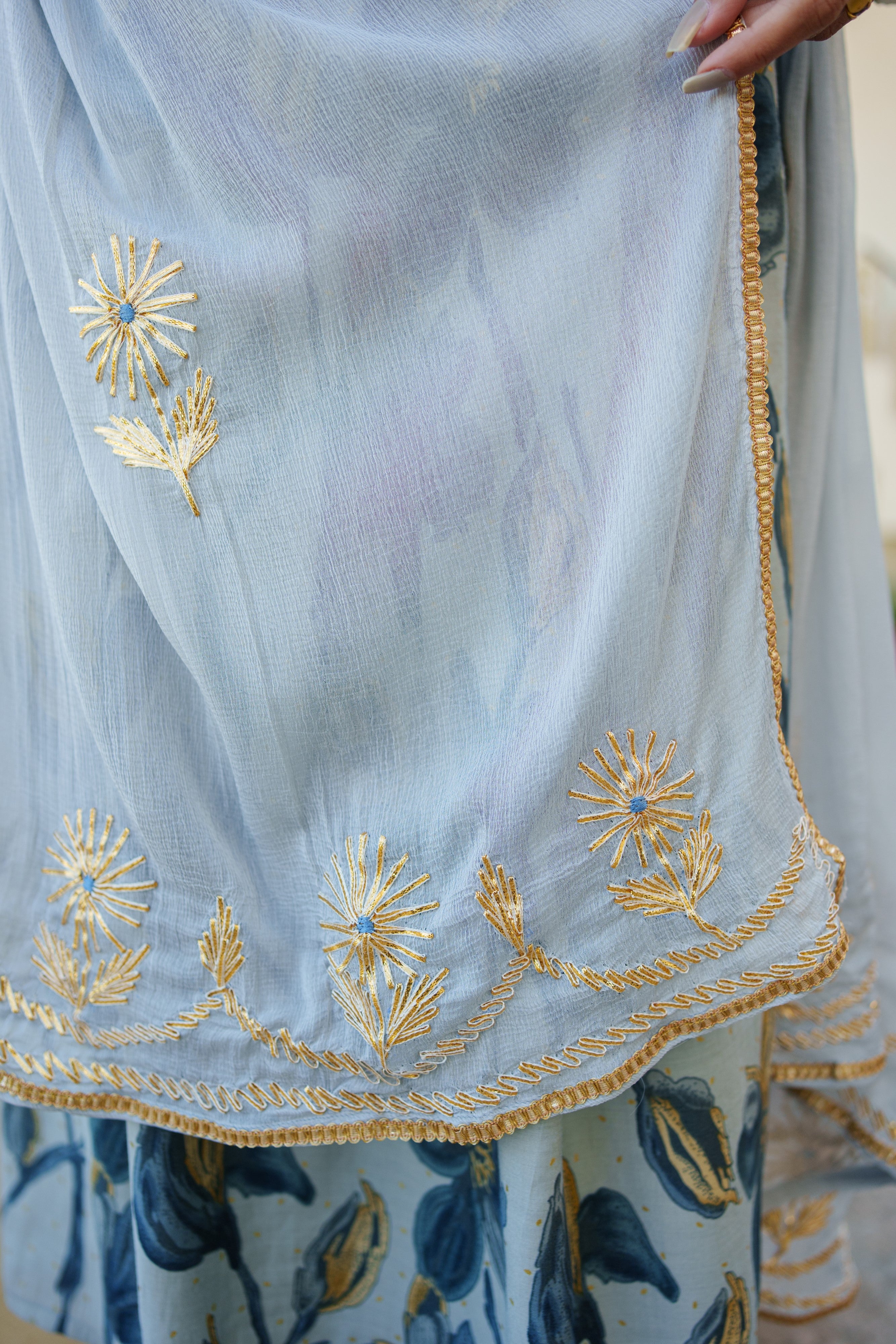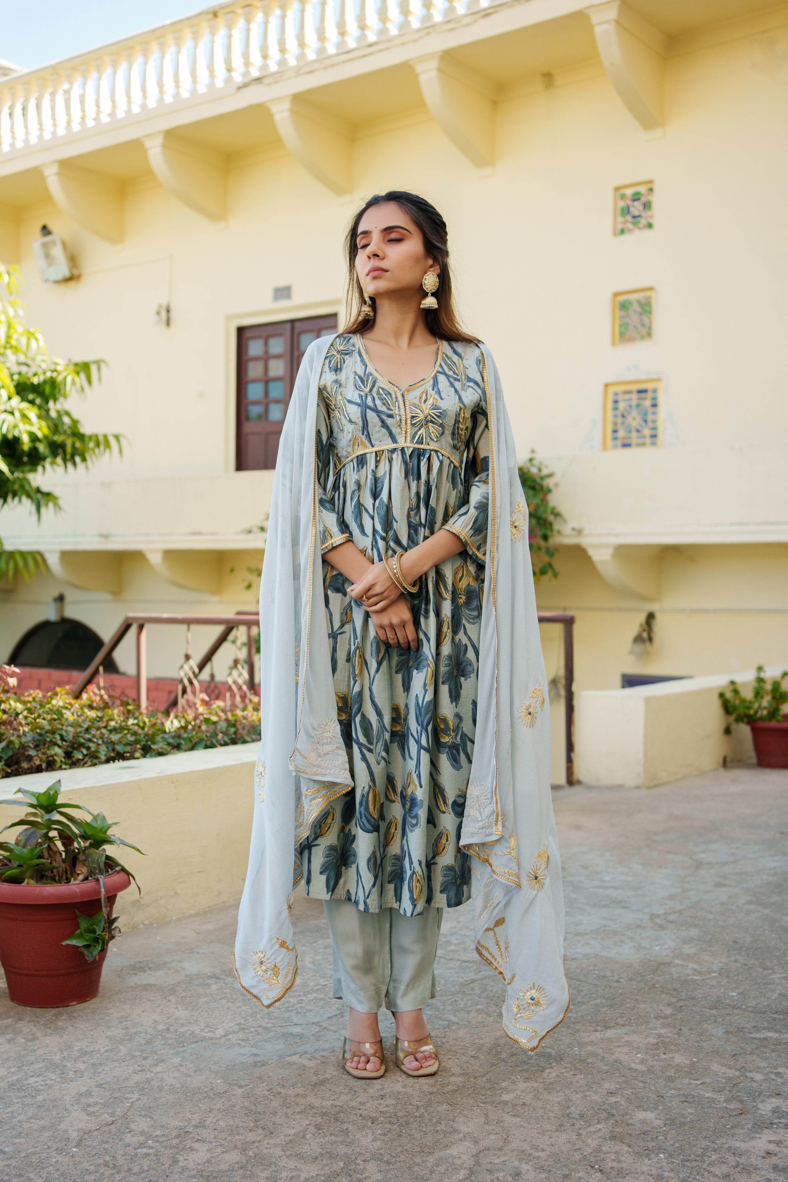 Grace meets elegance in this Blue Flair Alia Cut Kurta Set, beautifully adorned with gota lace and delicate bead work. The flowy silhouette and subtle embellishments make it a perfect choice for festive occasions and intimate gatherings.