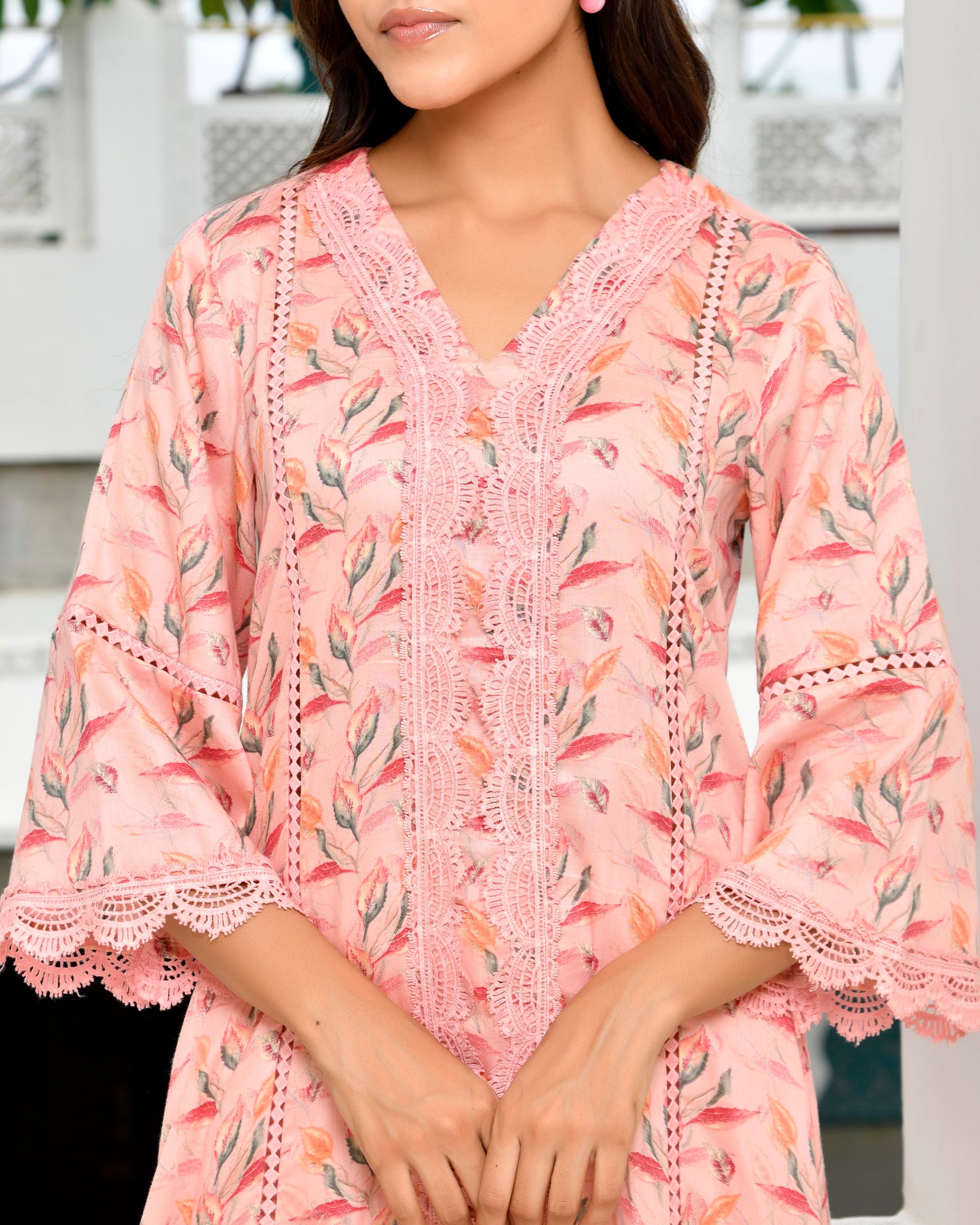 Step into effortless elegance with this beautifully crafted Peach Cotton Digital Printed Laced Kurta Pant Set. Made from soft, breathable cotton, the kurta is adorned with delicate digital prints and finished with lace detailing that adds a subtle, feminine touch.