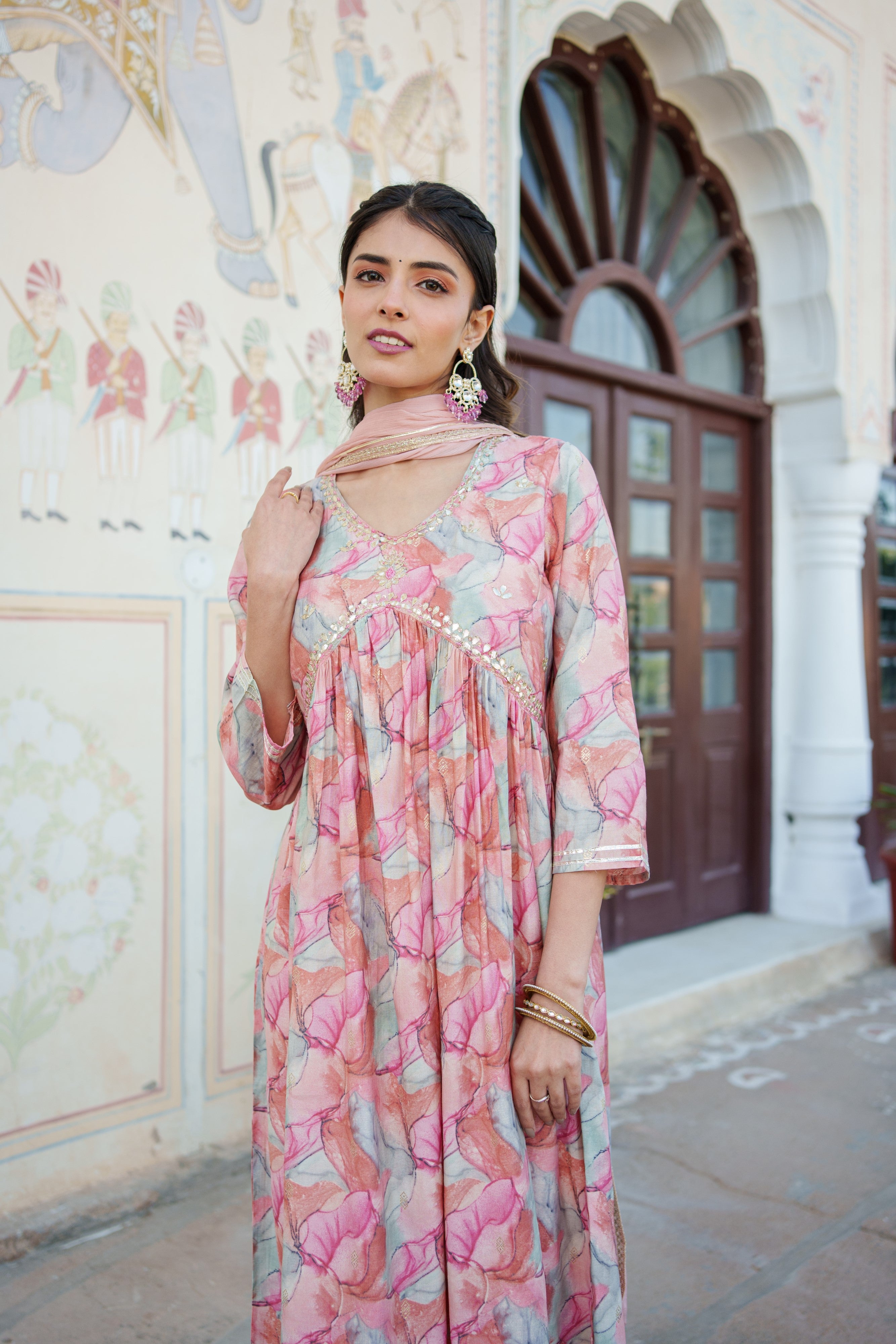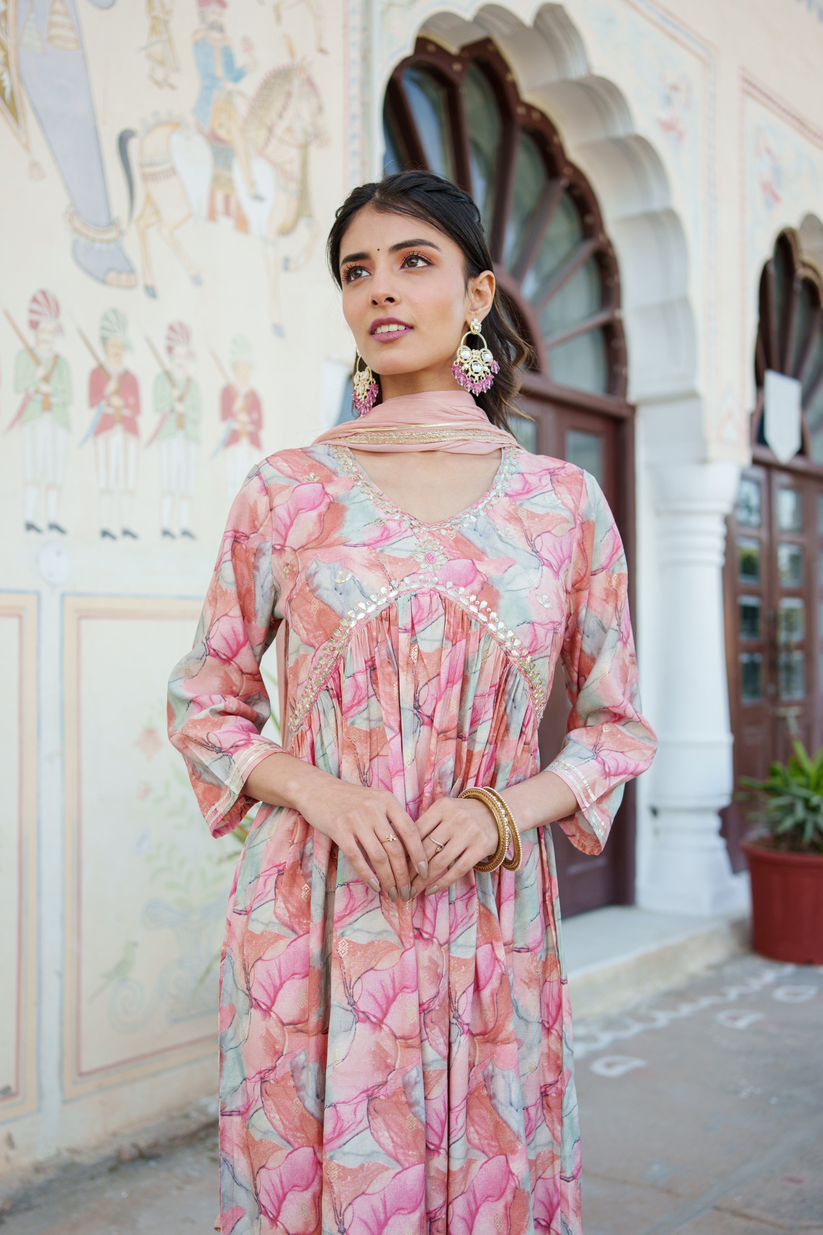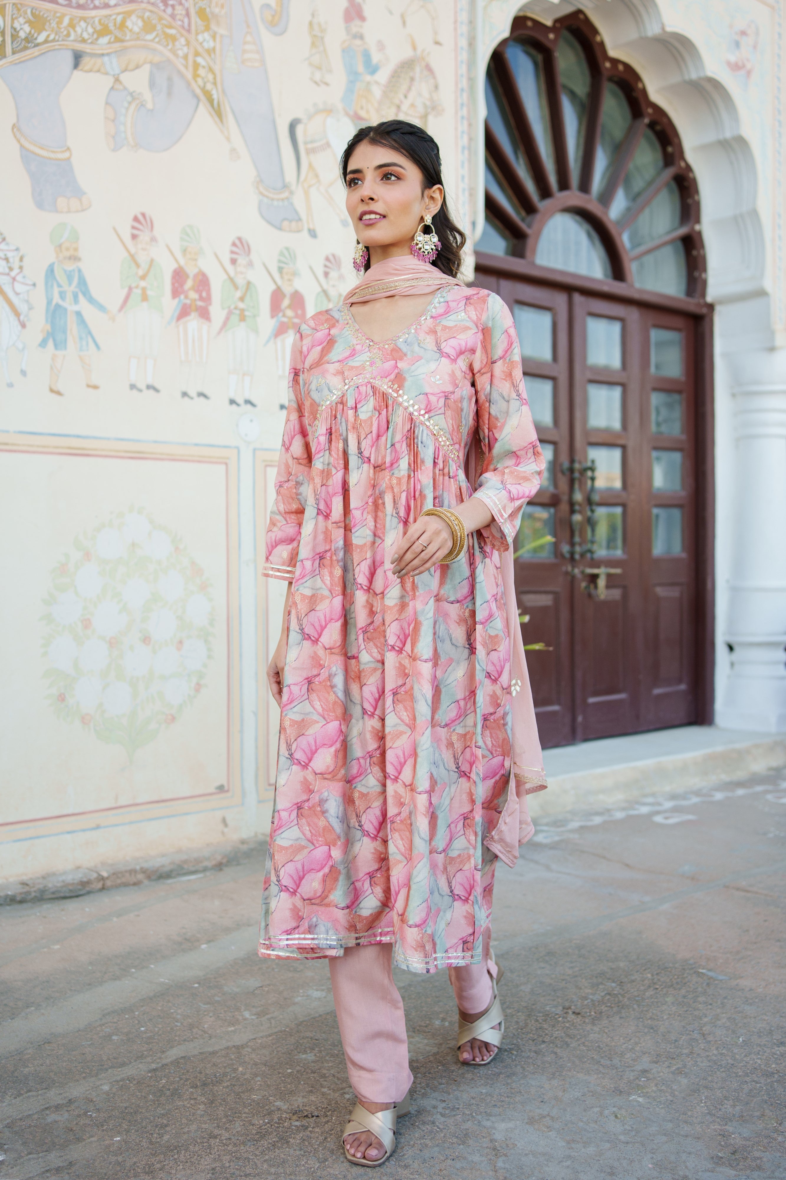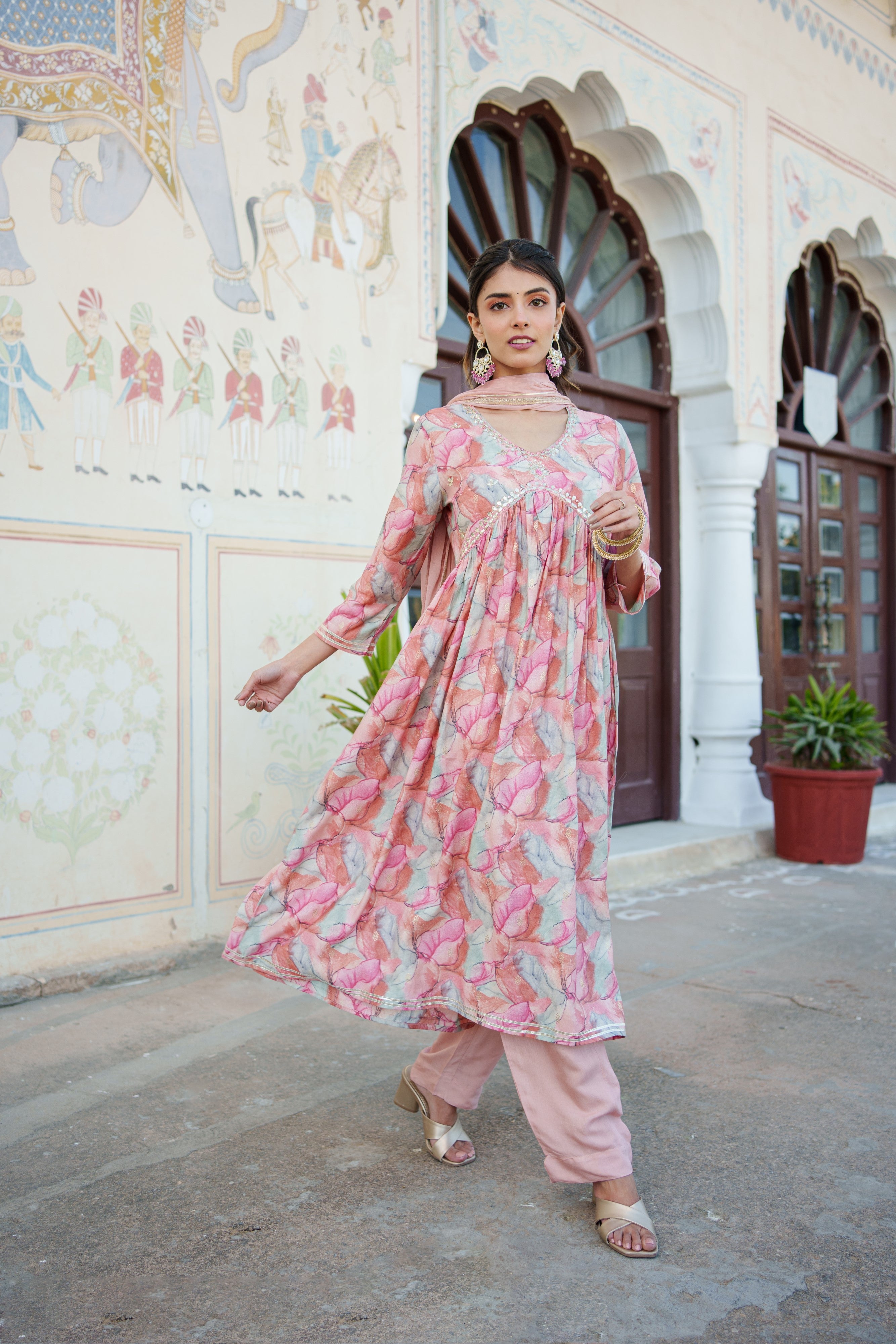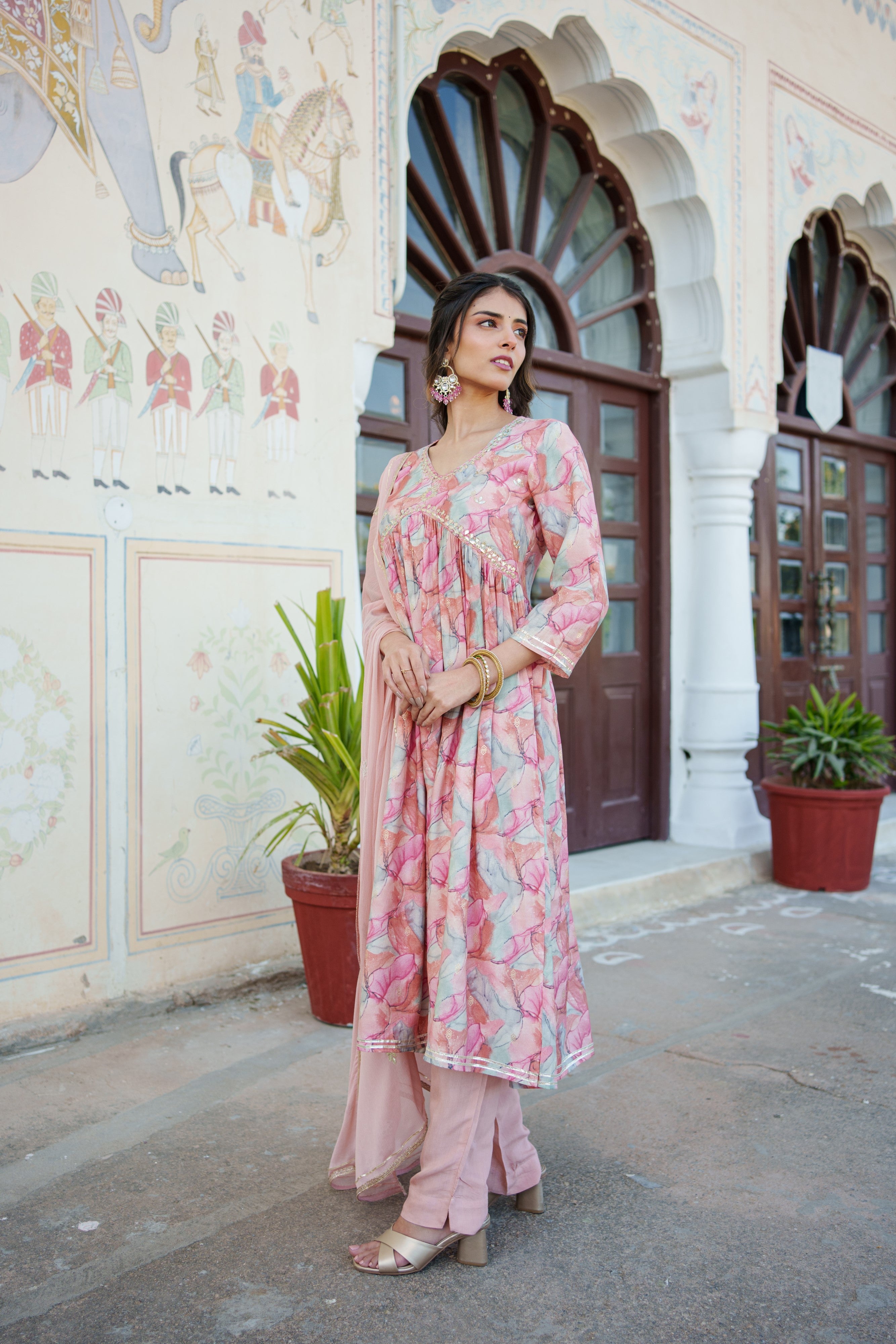 Elevate your ethnic wardrobe with this charming Peach Flared Alia Cut Kurta Set, featuring exquisite Cut Gota Patti work. This elegant 3-piece ensemble includes a flared kurta, straight pants, and a coordinating dupatta, making it a perfect pick for festive celebrations and traditional gatherings.